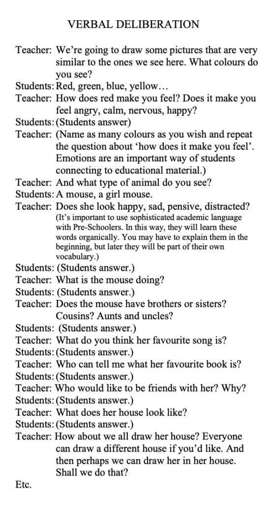 This scaffold fills this void. The technique uses critical thinking and verbal deliberation to make connections with what seems impersonal. Our young students will be actively dialoguing with each other while they consider images, listen to songs, or stories and this helps their brains to remain active. In this way, they’ll remember the material more deeply and for longer. The example we give here is from an art lesson, and you’ll see how you can adapt it to whatever story you are going to present.