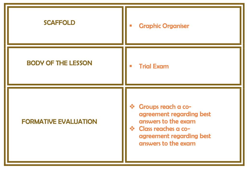 In the third step of the Mini-Lesson, the Formative Assessment, I’ve included elements of the Ethics of Excellence. In this case, the teacher doesn’t correct the trial exam, but rather the students do in their groups. They work together to form what they feel are the best answers to the questions on the trial exam according to a compilation of all their answers. Later, the class joins together to reach a consensus on the information.