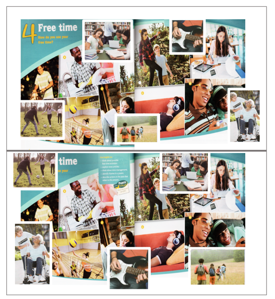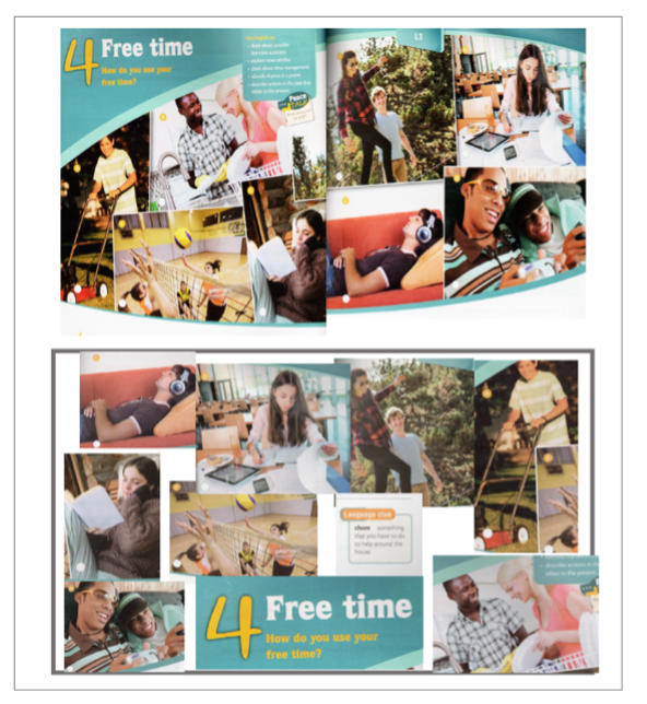 The concept of this scaffold is to distinguish between two ostensibly identical images – that originate from your students’ books or any resource you may be using. Some images appear in different places on the two copies, so that students are motivated to verbalise, negotiate and later write the differences between the two.