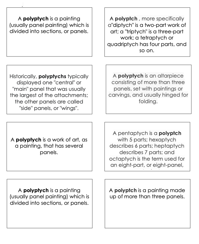 1. Students put one text box down at a time. One member of the group reads the text aloud. All group members identify the images that correspond to the definition read. They need to justify their choices. (Note: For most of the definitions, many of the images can correspond. The challenge is to justify each choice verbally so that the repetition of these justifications myelinate neurons.)